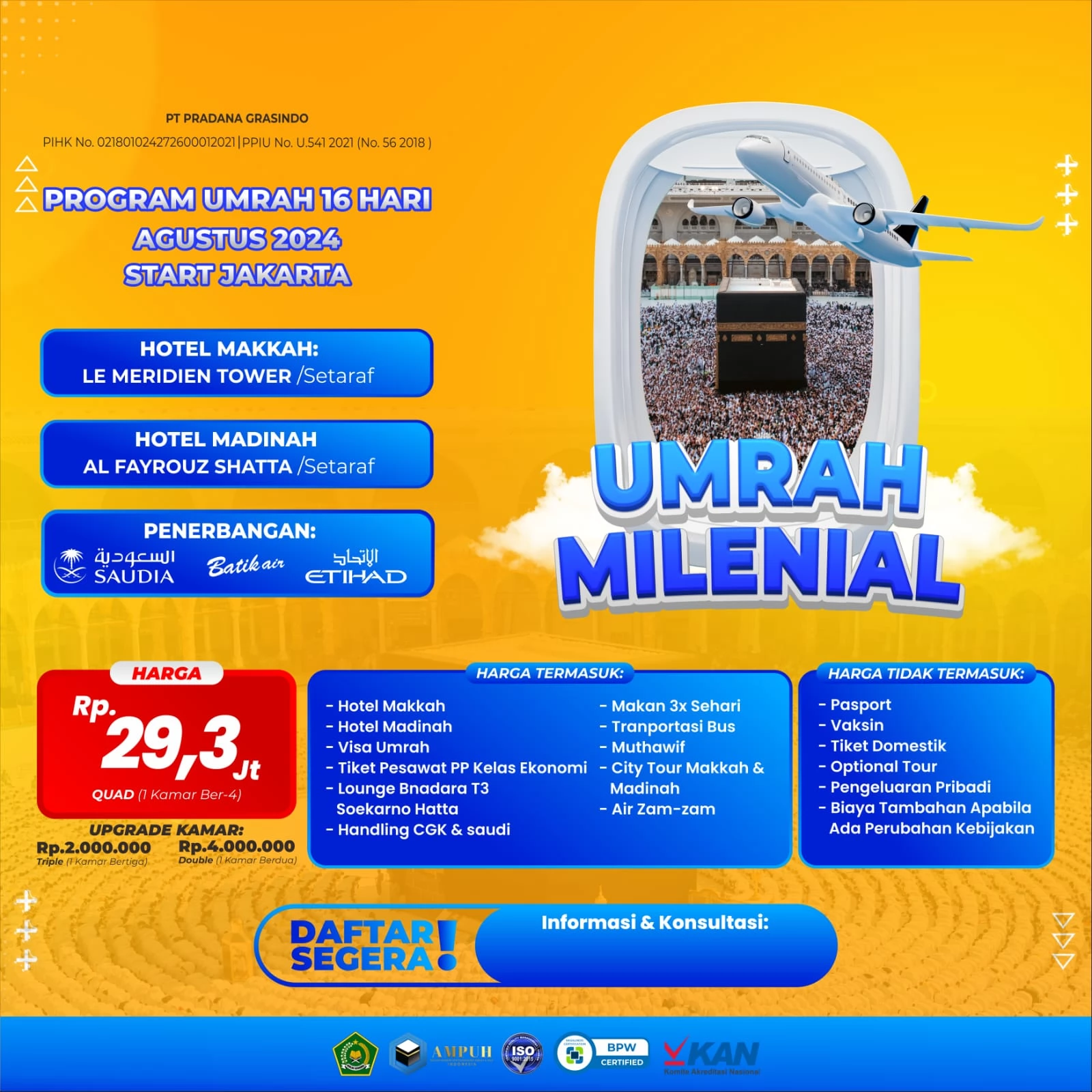 Harga Umroh BISA Jayapura Promo Paket umroh sangat sesuai dengan kondisi masyarakat Indonesia Mengenal Lebih Dekat Umroh BISA bersama Travel Al Zam Pilihan Paket yang Beragam Berbagai jenis paket umroh dari promo hingga spesial ditawarkan Travel Al Zam untuk kenyamanan dan kepuasan jamaah Harga yang Terjangkau Biaya umroh Travel Al Zam, yang dimulai dari 16.5 juta